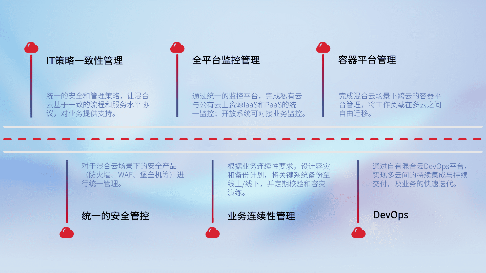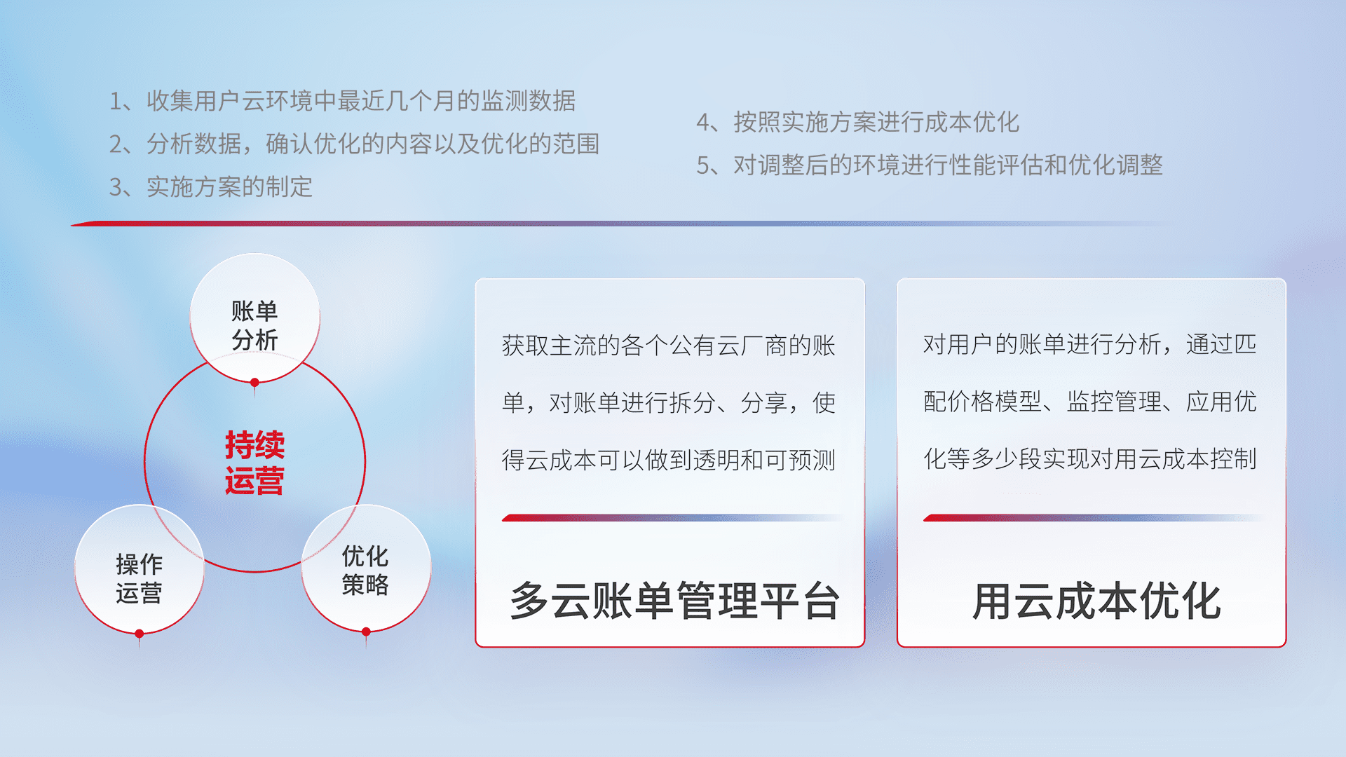通过多云纳管,,以统一的资源数据模型把客户的云资源进行抽象和封装,,进而实现对多云资源的统一操作,,,,保障云资源管理的可靠性、、稳定性与可用性。。量身定制化运维内容,,,配置、、、、开发运维、、、补丁管理、、备份、、、监控、、、认证和访问管理、、审计和日常巡检等,,,,保障在用云过程中的可靠度,,,,稳定度以及高可用率。。