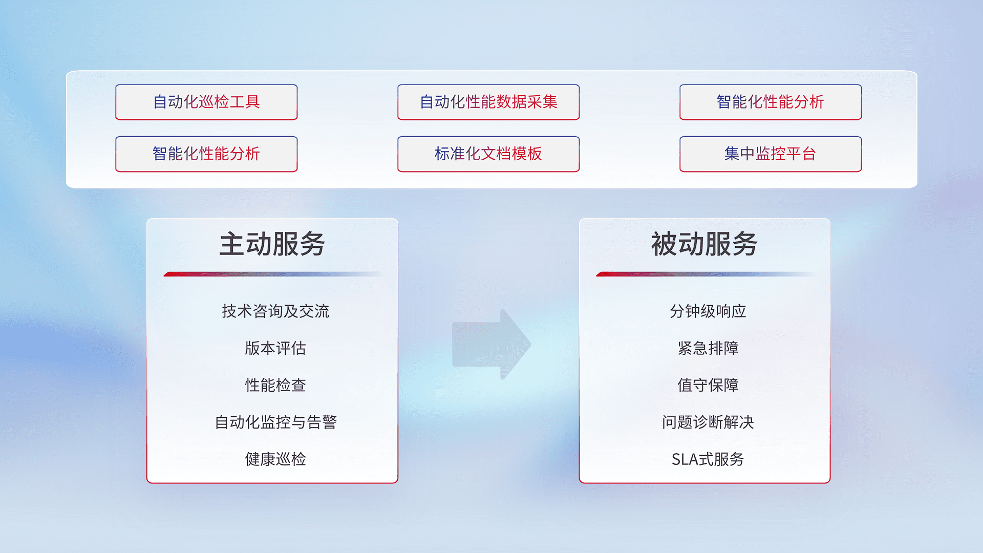 智能化工具和标准化文档,,,,保障服务质量,,,提供主动服务(包含技术咨询、、、、版本评估、、、性能检查、、、自动化监控与告警、、、健康巡检)和被动服务包含(分钟级响应、、紧急排障、、、值守保障、、、问题诊断解决、、SLA服务)。。。。