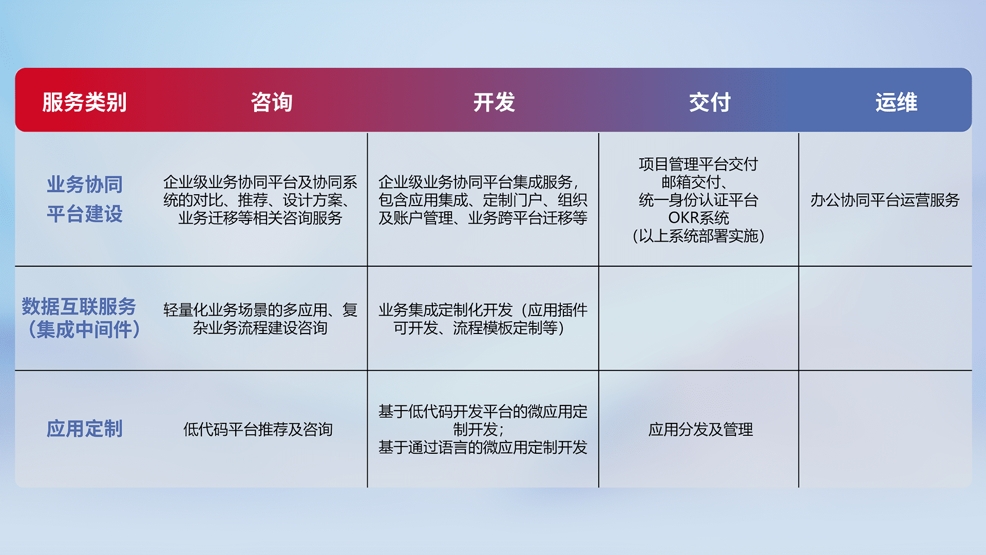 针对钉钉、、企微、、、IDaas等平台级产品提供产品的规划、、、方案、、交付、、定制化开发等服务,,实现如统一协同办公、、、智能客户服务、、、混合会议管理、、智能数据查询、、、、等业务场景,,,,实现数字化转型。。